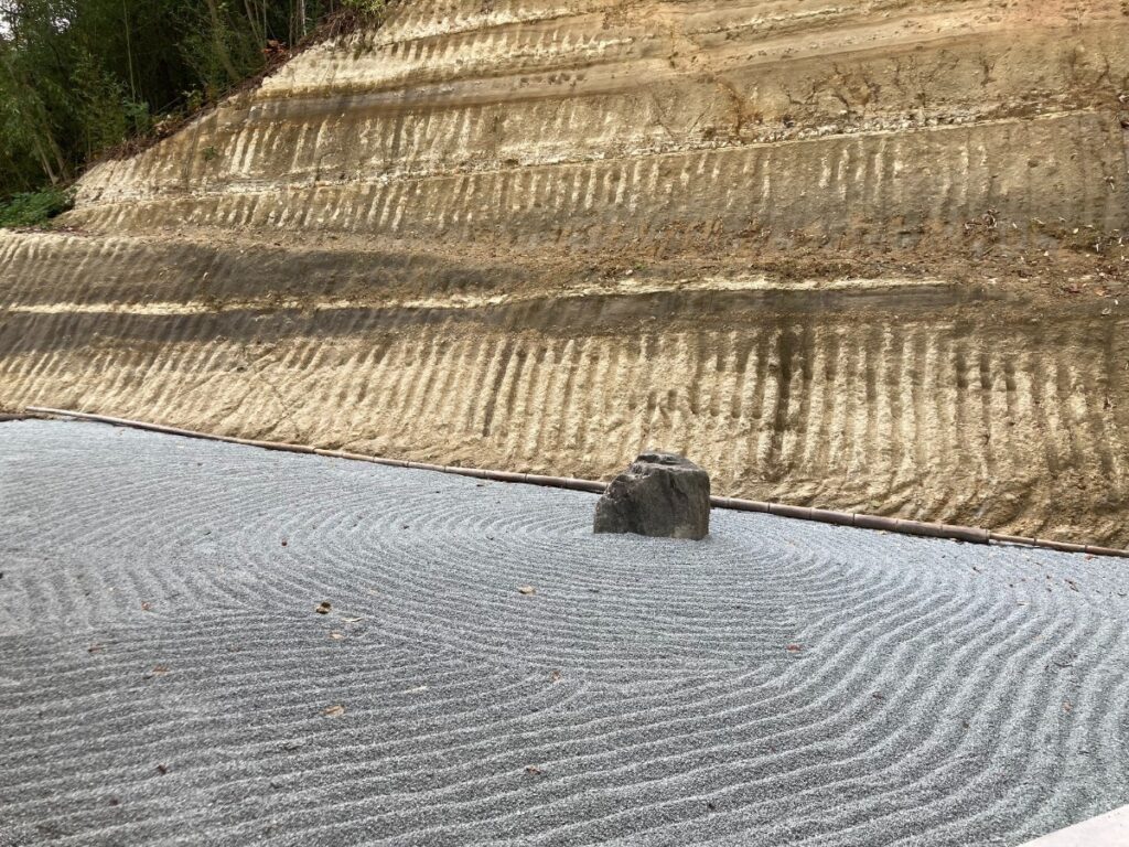 また、少し風紋の様な跡が出るように重機で加工してもらい、青目石と調和する感じを演出させました。