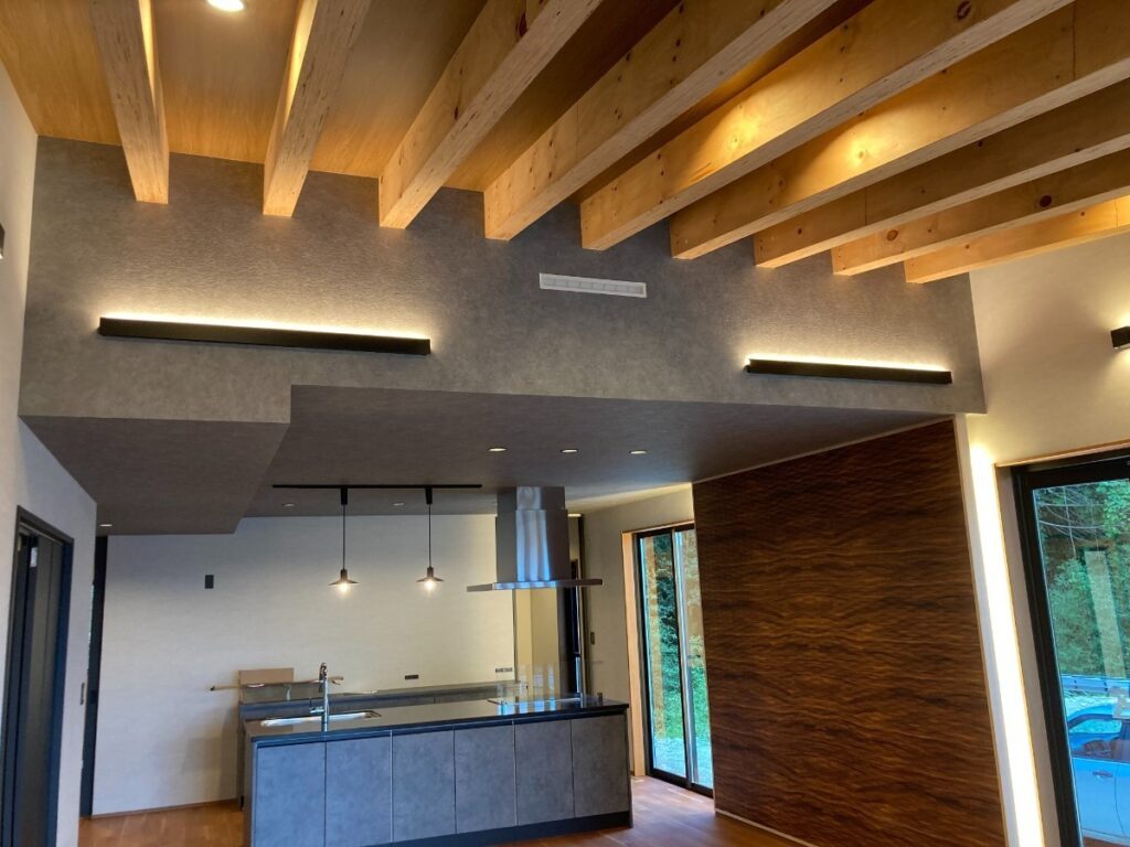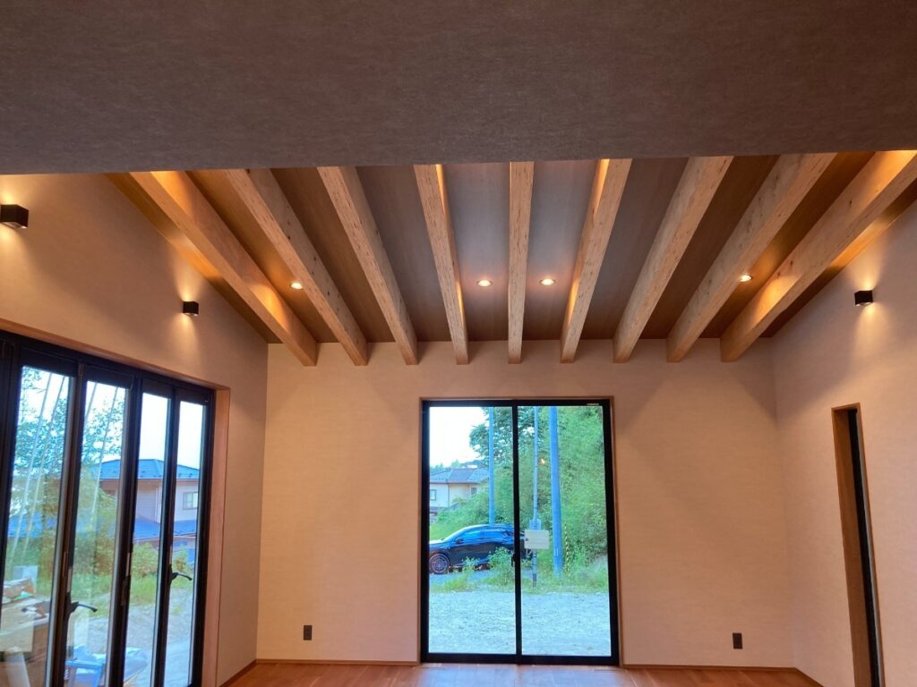 そして1Fリビングの天井は455ピッチで梁を表し、外壁材とは違う木材の良さを表現しております。