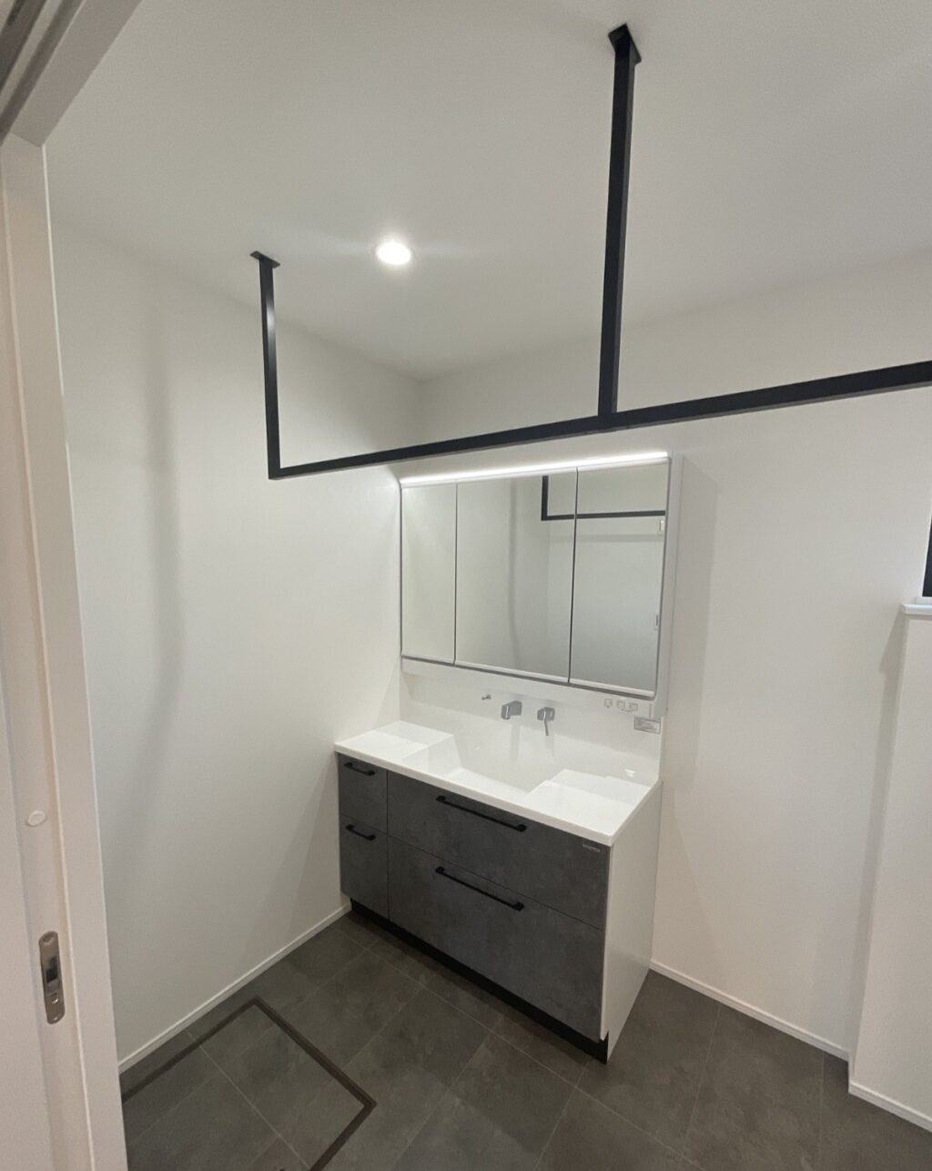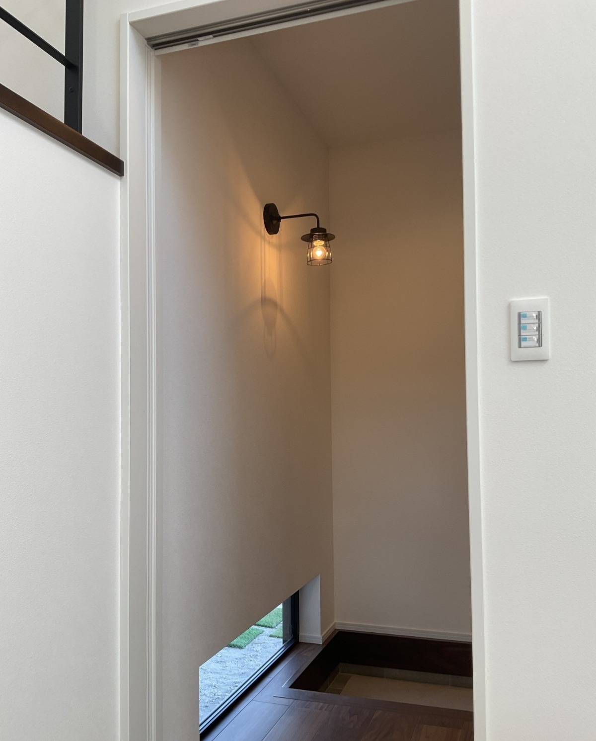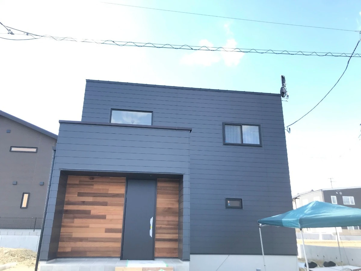 グッドデザイン賞を受賞した金属サイディングをメインに、レッドシダー天然木のサイディングを玄関前にアクセント貼りし、おしゃれでインパクトのある外観に仕上げました。