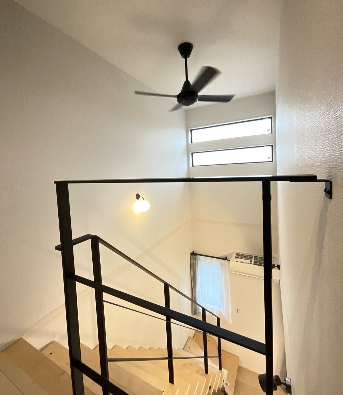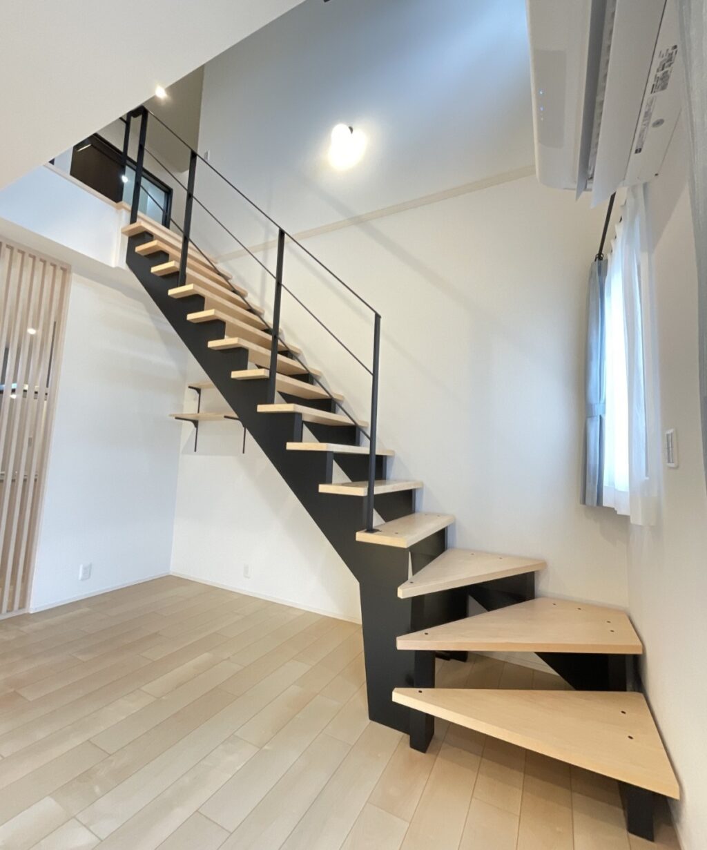 LDKにはアイアン手摺のオープン階段、スリット状のインテリア格子をレイアウトし開放的な中でアクセントにもなっております。