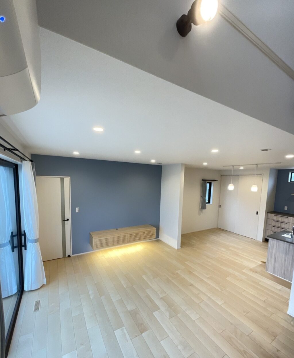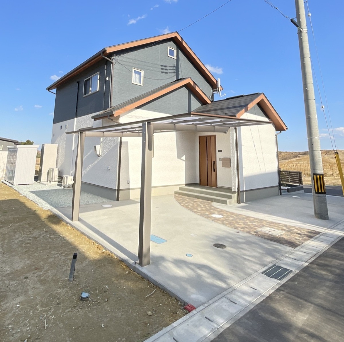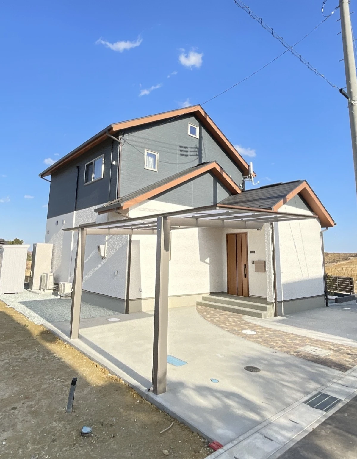 切妻屋根の外観は、ネイビー・ホワイトのツートンカラーに木目調の軒でアクセントを加えインパクトが有りながらも自然に溶け込むやわらかい雰囲気を醸し出しております。