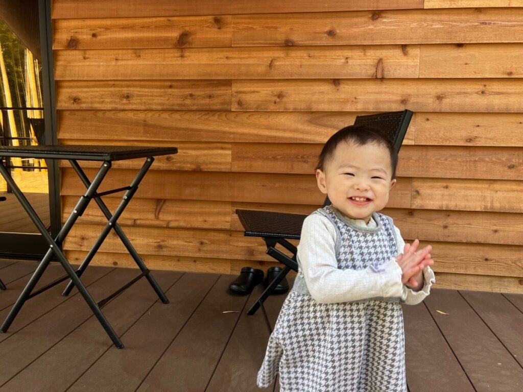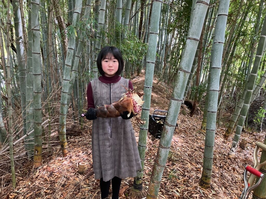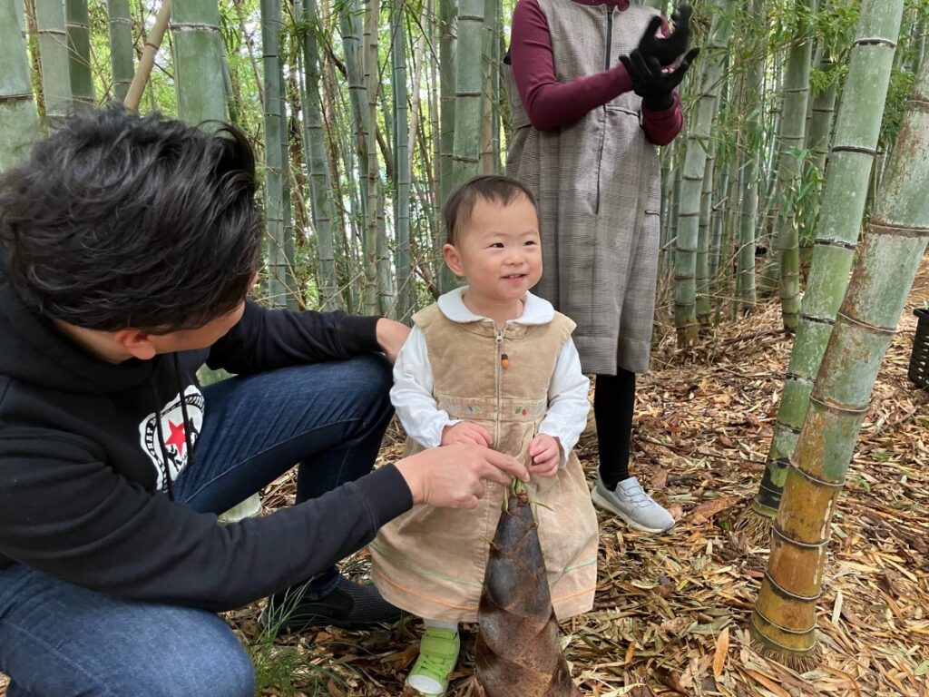 次女さんも筍に触れてうれしそうです。筍獲りの後は楽しいBBQです。